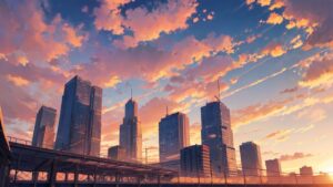 ピンク色の空/夕暮れ/都会/イラスト素材