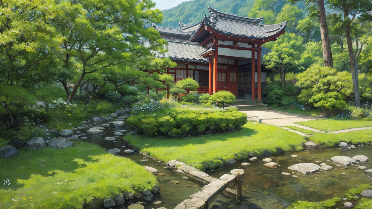 和風建築/神社/庭園/小川/イラスト素材