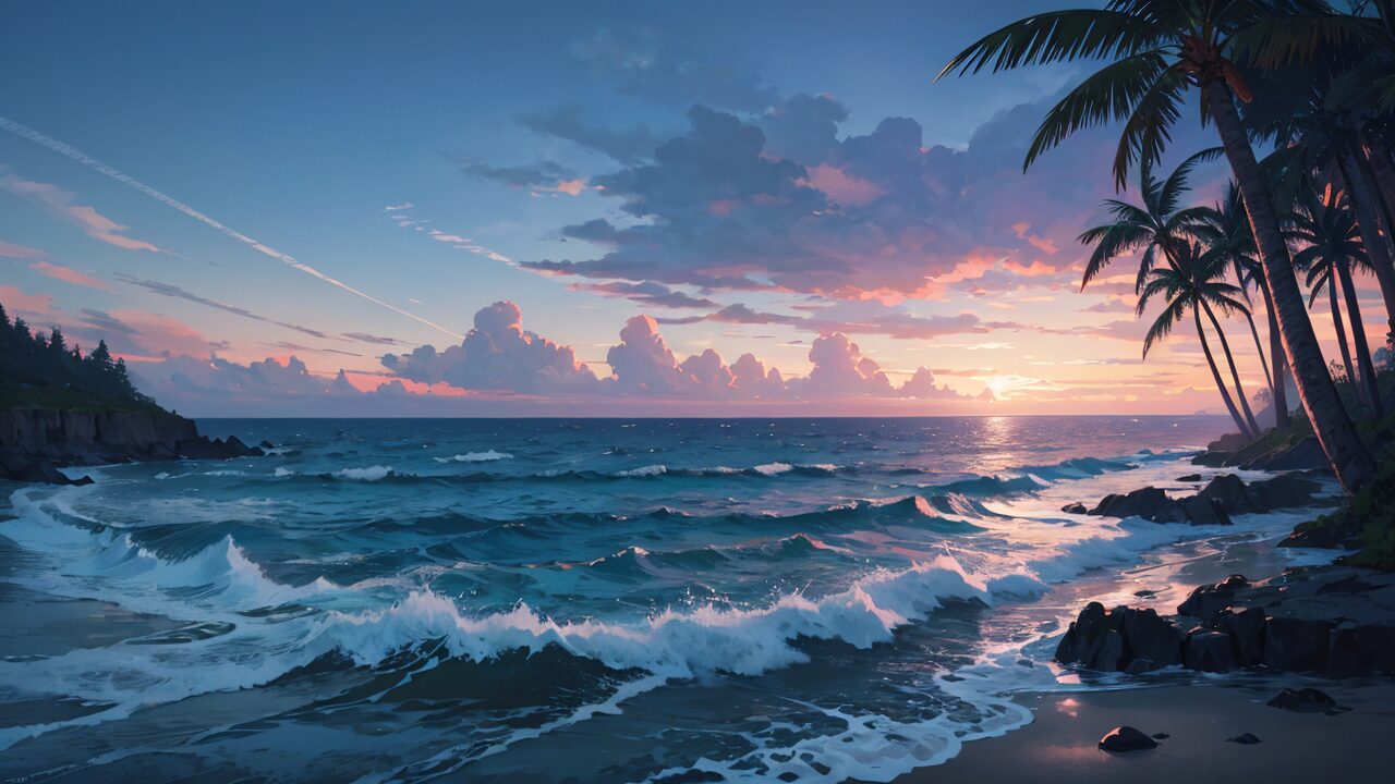 自然/海/夕暮れ/ヤシの木/イラスト素材